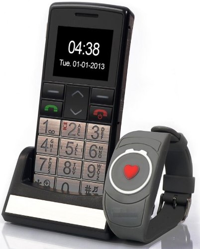 - Avec montre SOS et touche SOS (jusqu'à 5 numéros appelés dans l'ordre + envoi d'un SMS). L'appui sur la touche située sur la montre déclenche le SOS (la montre n'est pas vocalisée, elle permet simplement le déclenchement de l'alarme). La Montre fonctionne par radio dans un rayon de 20 mètres autour du téléphone. Montre étanche, ne se recharge pas, pile durée de vie jusqu'à 5 ans (vous pouvez alors changer la montre). La touche SOS au dos du téléphone a la même fonction que la montre.